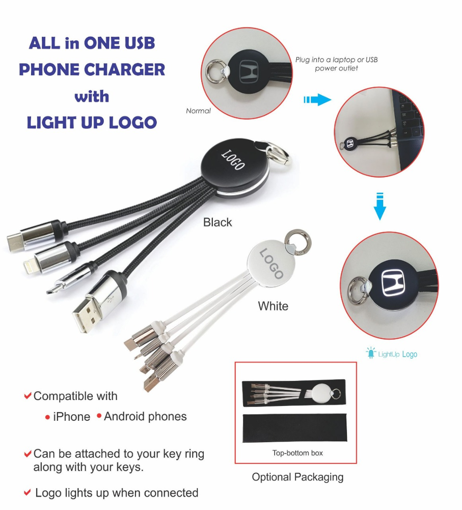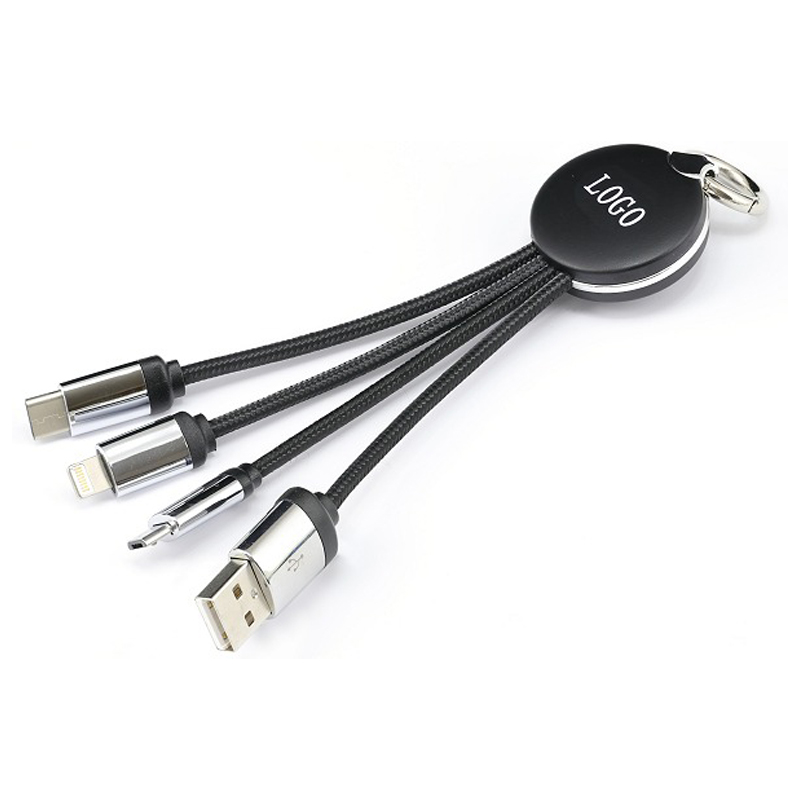 Light Up Logo 3 in 1 Usb Cable Keychain Multi Quick Charging Cable For iPhone and Android Phone